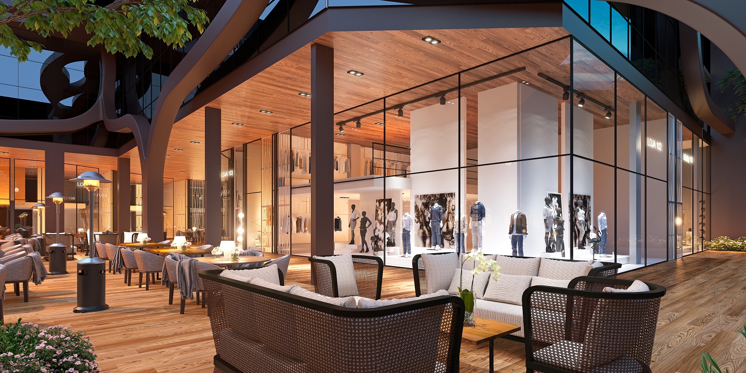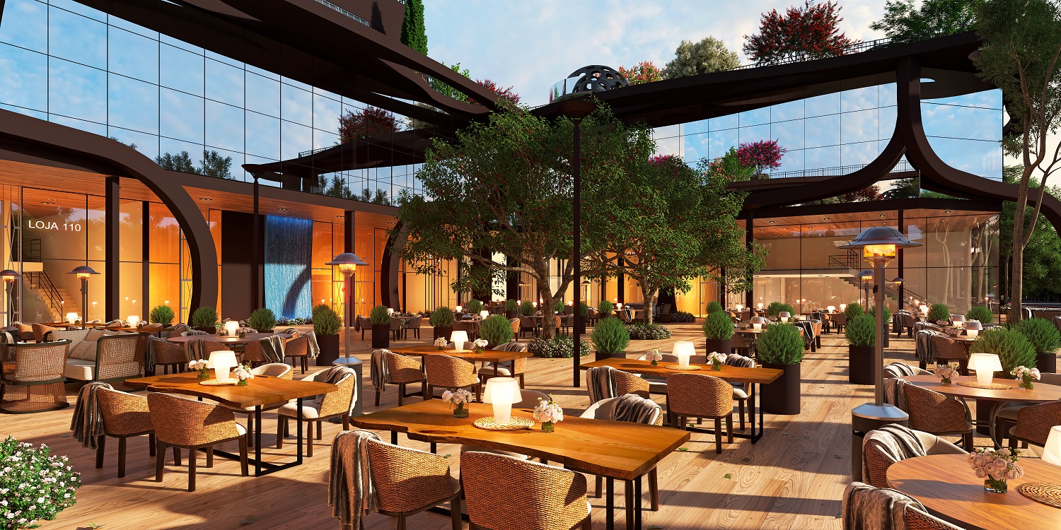 A porta de entrada do Viverone Garden é a praça aberta com piso aquecido, inspirada nas praças da Europa. Abraçada por uma estrutura em curvas, construída em painéis ACM, lembra obras de Dubai. Além da durabilidade, a armação é sustentável, sem necessidade de pintura. Na praça, mobília e detalhes técnicos garantem a realização de eventos e a instalação de pontos gastronômicos. As salas frontais, que abrigam lojas, têm pé direito duplo, com portas de 5 metros de altura, dando maior sofisticação ao ambiente. Com dimensões variadas, todas são de alto padrão. Abaixo, no primeiro pavimento, um amplo estacionamento rotativo com capacidade para 1,5 mil vagas por dia, além de um conjunto de banheiros.
