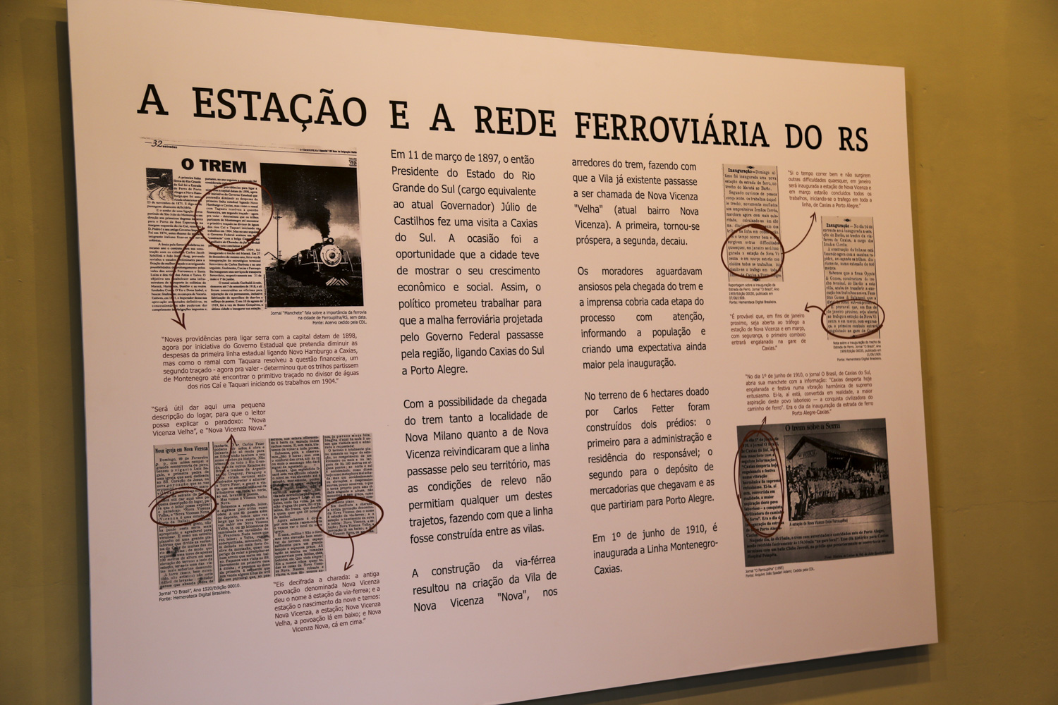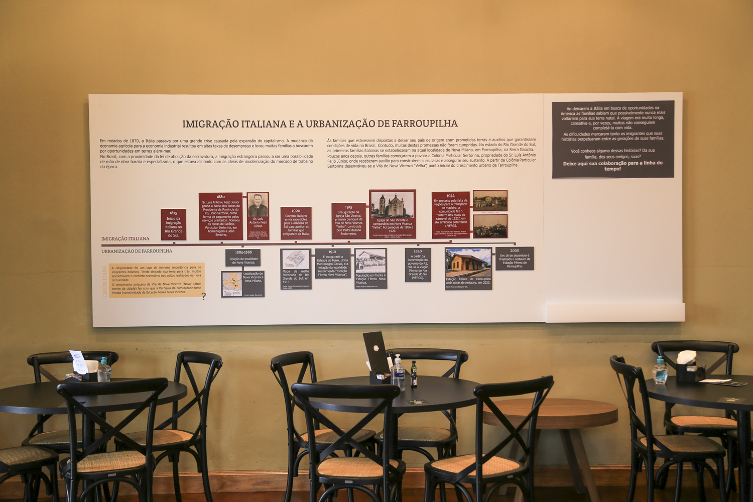 No espaço gastronômico, que abriga o Estação Nova Vicenza Gastropub desde julho deste ano e que já é um ponto de confraternização aberto ao público, pode ser vista uma linha do tempo que começa no ano de 1875, no início da imigração italiana, até os dias atuais, em três temas: a imigração, a ferrovia e a urbanização.