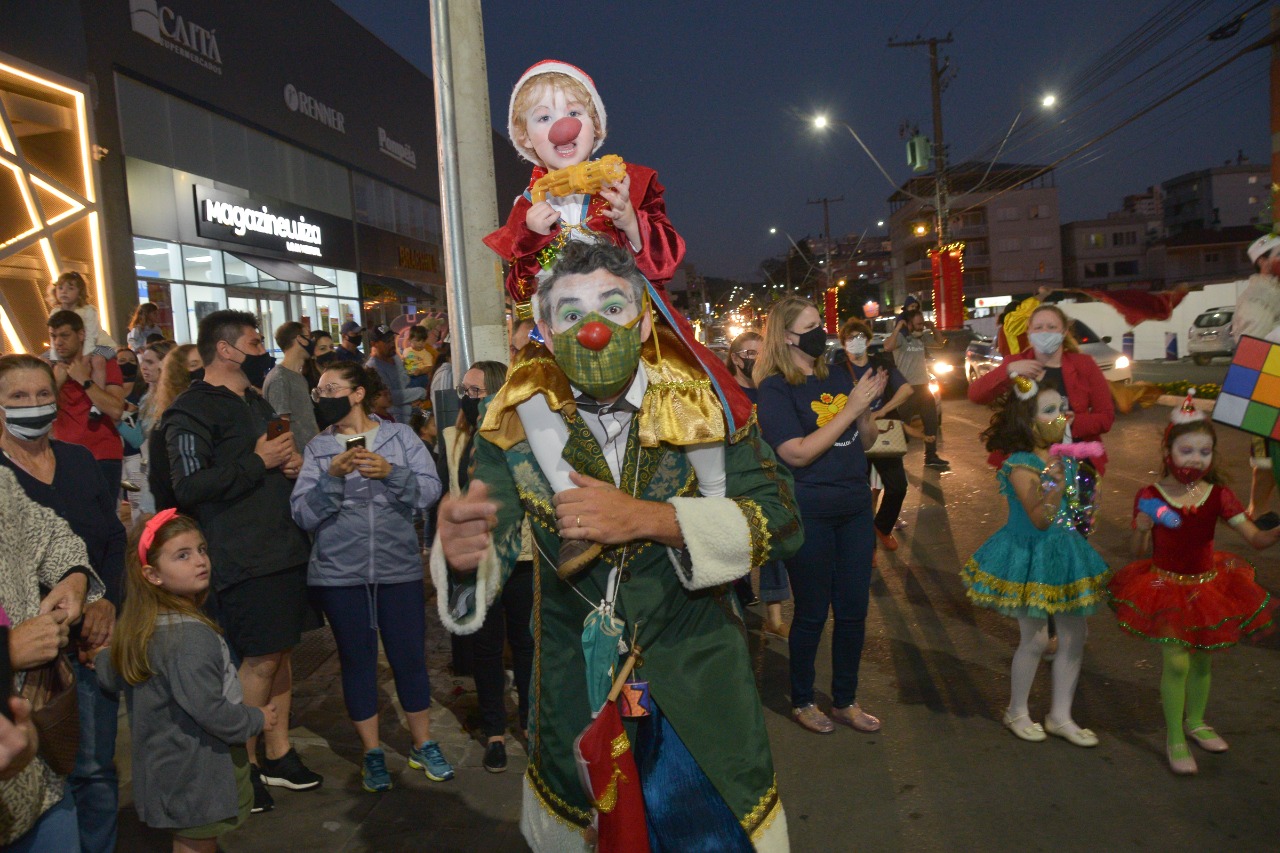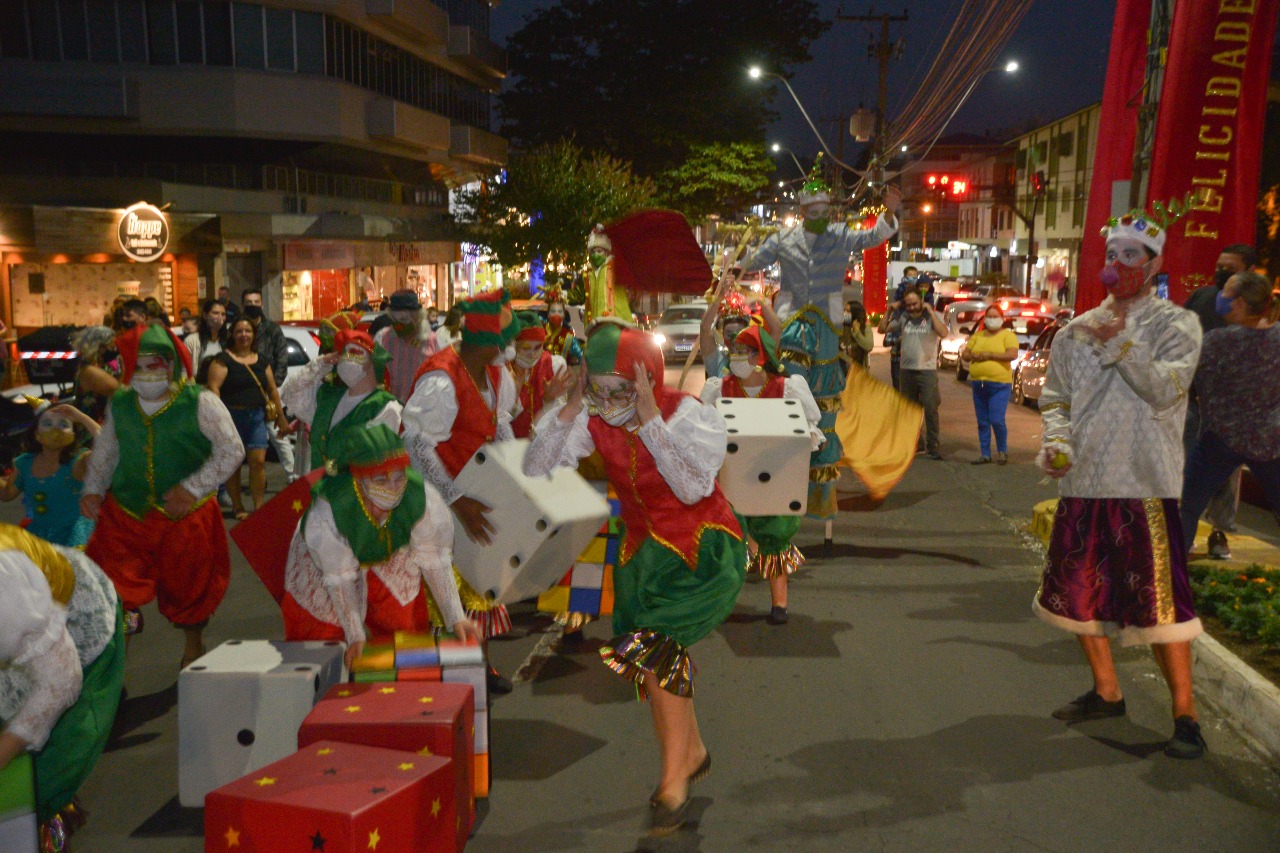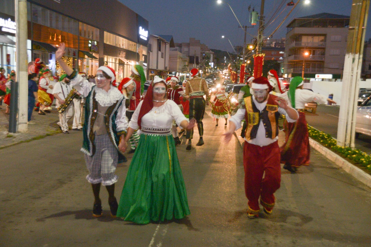 O Cortejo Natalino composto pelos integrantes do Grupo Teatral Hora Vaga, Cia Acto, Quarteto de Jazz da OMG e APAE percorreu as ruas de Garibaldi levando muita alegria e convidando a todos para a chegada do Bom Velhinho.