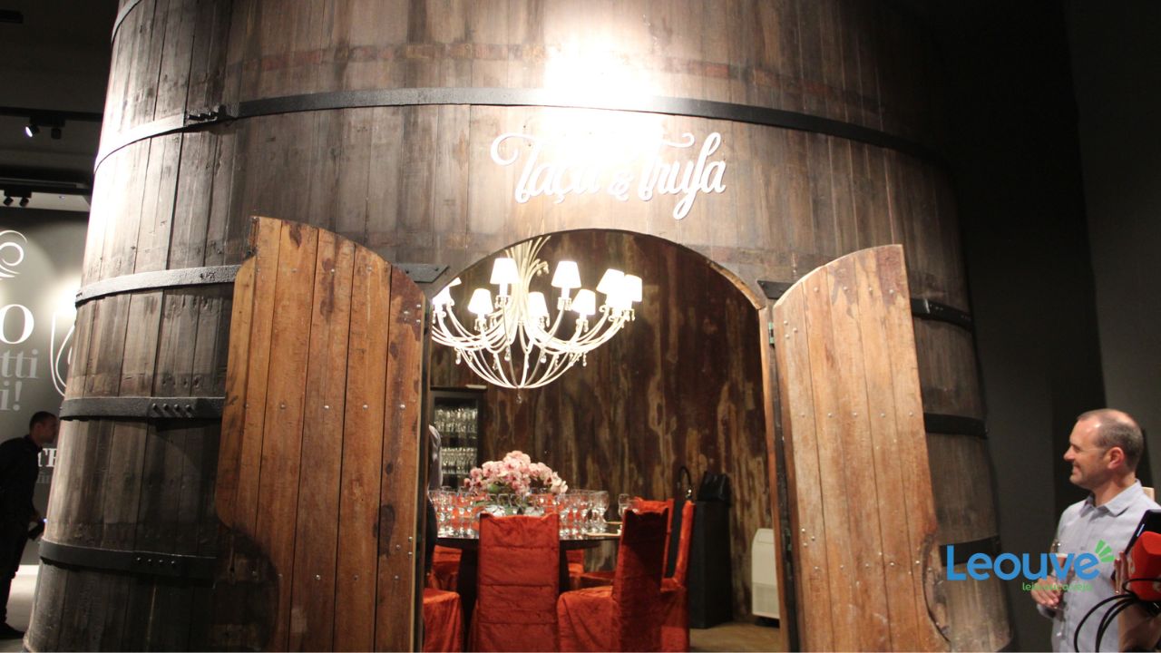 – A ambientação também deu novo uso a antigas pipas de madeira. Elas compõem, agora, um grande painel ondulado no início do roteiro. Em muitas de suas aduelas permanecem os cristais advindos do armazenamento do vinho, conhecidos tecnicamente como bitartarato de potássio. Esse material é raspado das pipas antes que o vinho de uma nova safra seja colocado nela. O bitartarato de potássio é vendido para a indústria farmacêutica, que os transforma em sal de frutas, creme dental, creme esfoliante e jóias; – Outro elemento presente nos corredores são os pupitres. Essas espécies de cavaletes acondicionam, numa posição de 45 graus, as garrafas de espumante de cabeça para baixo a fim de que façam a decantação dos sólidos, originando espumantes elaborados pelo método Tradicional. Aqui, portanto, não é só um elemento decorativo. Todos os pupitres dispostos têm espumantes da linha Acordes e Astral, o segundo elaborado com uvas biodinâmicas;