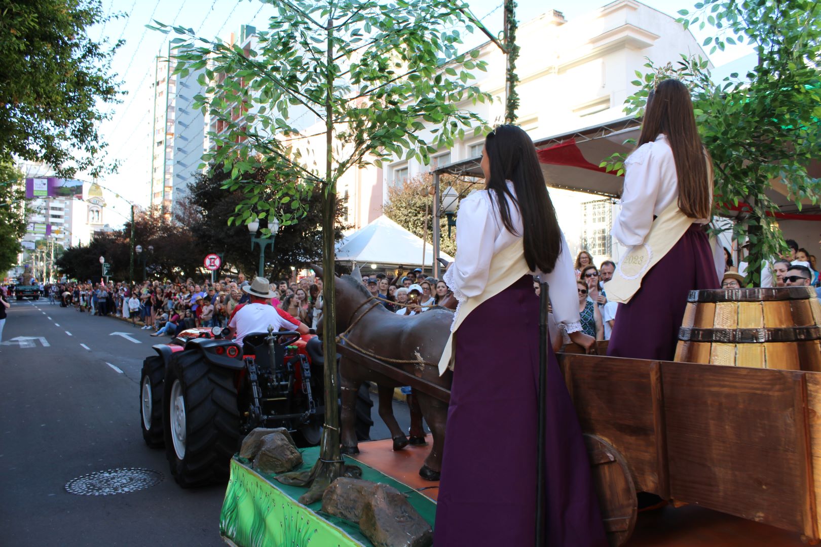 O barco trazendo os primeiros imigrantes italianos deu início ao Desfile de Carros Alegóricos da Vindima, na Via del Vino, no domingo (21). A ala abriu passagem para os momentos de história, cultura, fé e trabalho. No total, cerca de 200 figurantes participaram da atividade que reuniu sete carros alegóricos, caminhões e tratores.