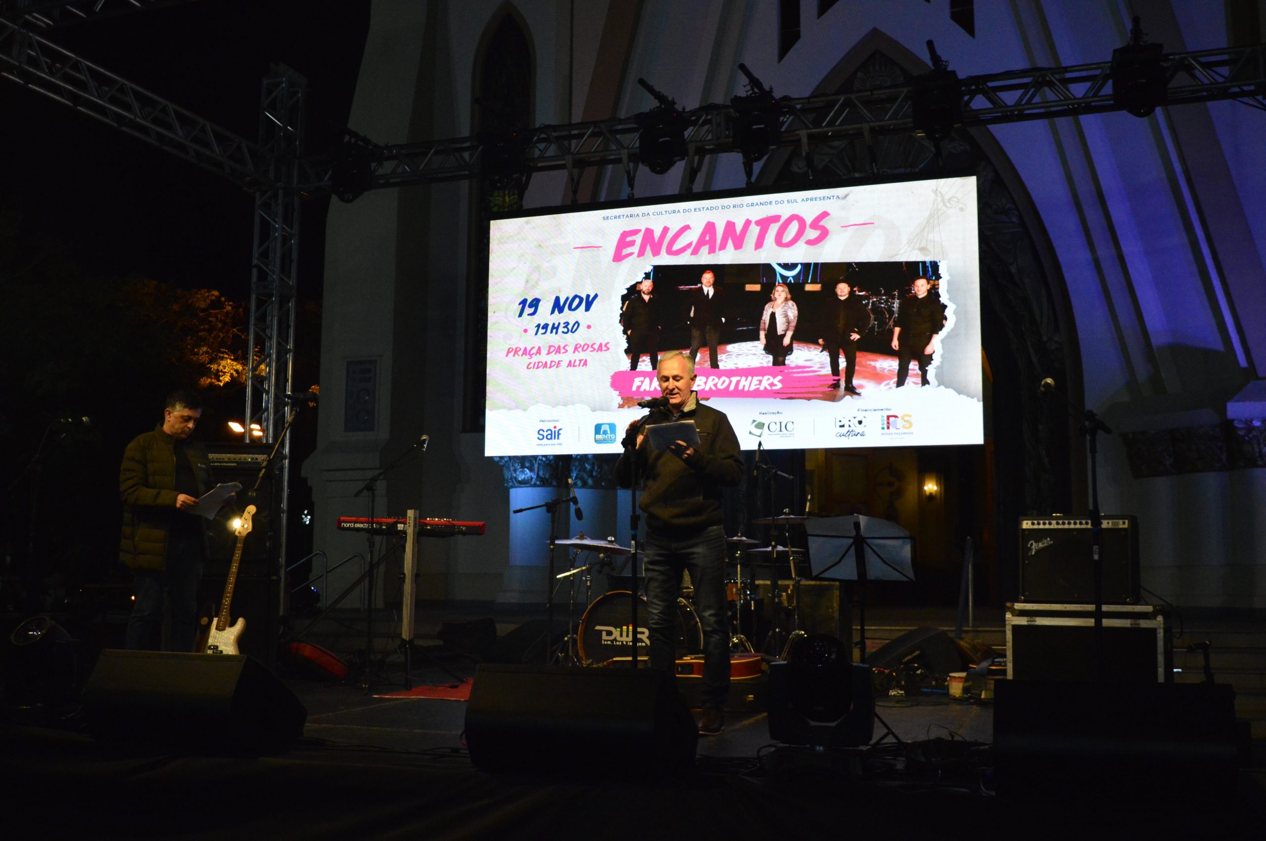 Teve quem dançou, quem cantou e quem preferiu assistir numa boa. Independentemente da escolha, o público curtiu e se emocionou com a enérgica apresentação do grupo Farina Brothers, na abertura do projeto EnCantos, na praça Rui Lorenzi, a Praça das Rosas, na Cidade Alta, em Bento Gonçalves. A iniciativa, realizada pelo Centro da Indústria, Comércio e Serviços de Bento Gonçalves (CIC-BG), tem sequência no dia 28 de novembro, no Parque de Eventos, às 18h30min – também com a banda bento-gonçalvense no palco. A agenda segue, também, em dezembro.