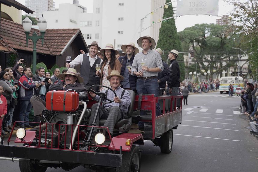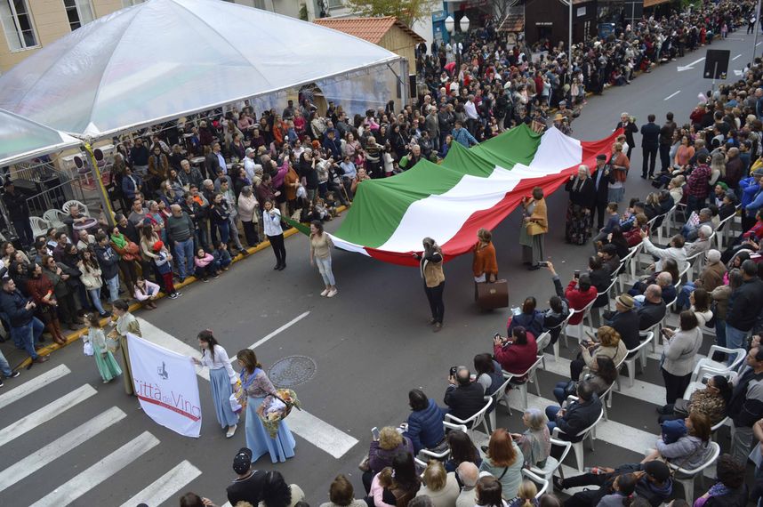 A abertura coube ao hilário Tasta Vin, o personagem-símbolo da Fenavinho. Fanfarrão, não se contentou com apenas uma passagem pela avenida e foi a síntese do desfile: alegre e divertido, pegando carona em caminhões, subindo em tratores e empurrando os carros. Caracterizadas como imigrantes recém-chegados à cidade, autoridades como o prefeito, Guilherme Pasin, e o presidente do Centro da Indústria, Comércio e Serviços (CIC-BG), Elton Paulo Gialdi – artífices do retorno da Fenavinho após oito anos –, passaram num tuc-tuc celebrando a alegria da festa. Os descendentes dos trentinos deram sequência ao desfile, representados pelos integrantes do Circolo e da Famiglia, seguidos do carro Maria Fumaça, da operadora turística Giordani Turismo.