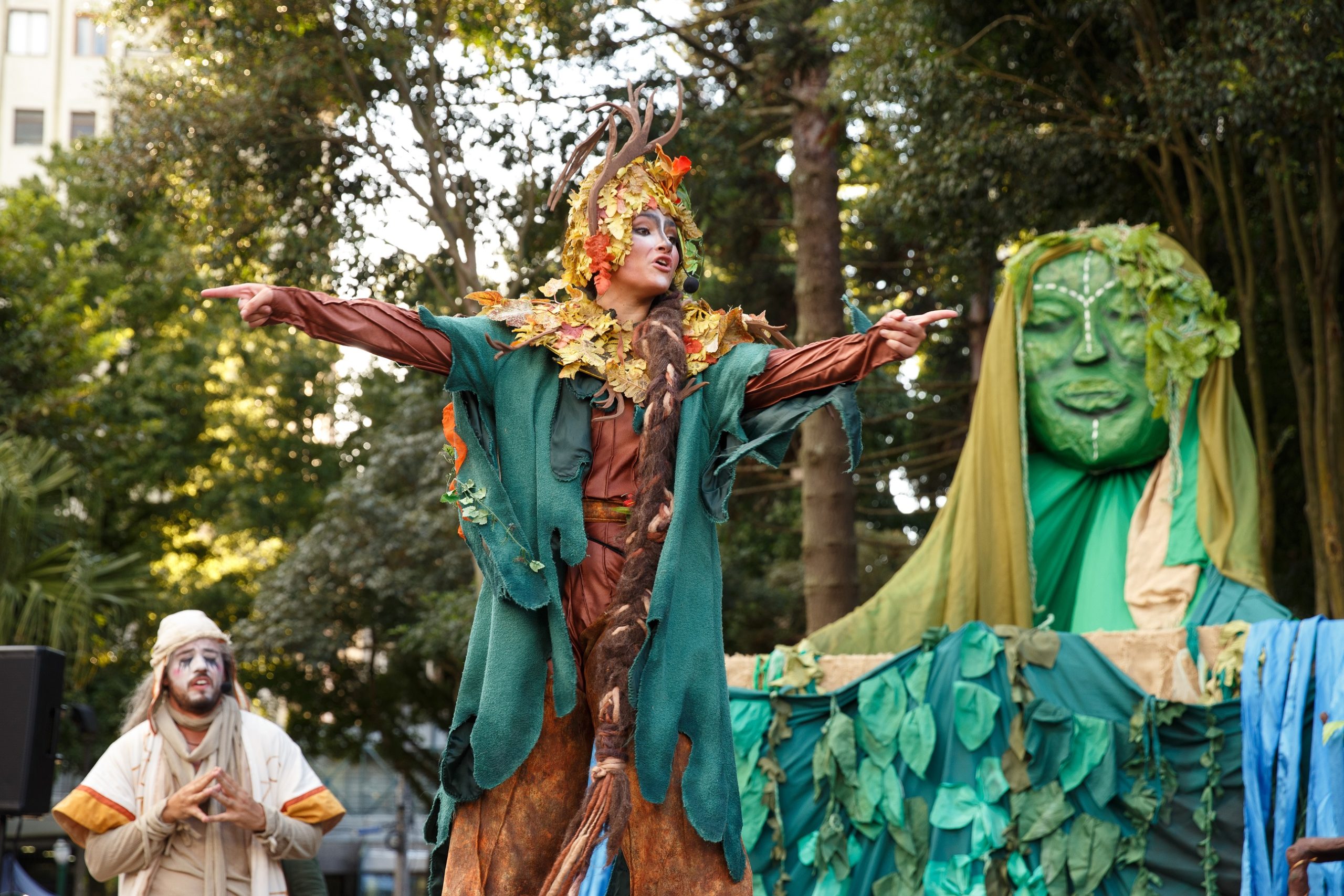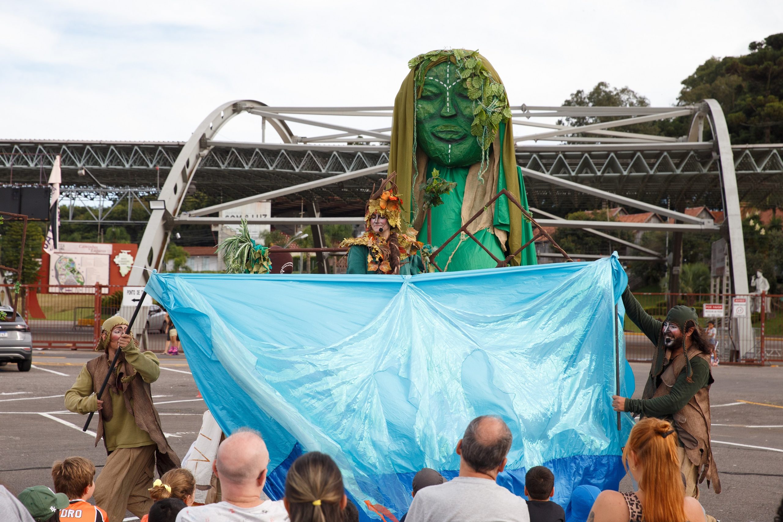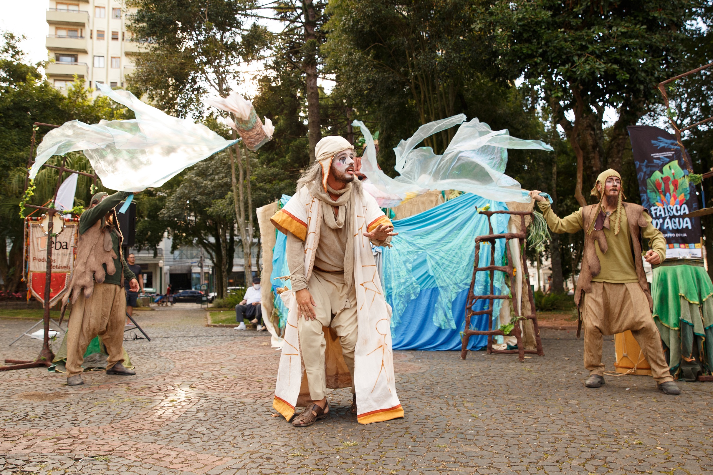 “Faísca d’Água”, produção do Grupo Ueba Produtos Notáveis, explora o confronto desafiador entre a natureza e a humanidade, destacando a água como elemento crucial. Dois seres sábios, representando a humanidade e a natureza, se encontram. A natureza decide retirar a água da humanidade devido ao mau uso desse recurso. Agora, a humanidade precisa convencê-la a dar outra chance, compartilhando contos que evidenciam a capacidade de aprendizado e evolução humana por meio do folclore, dos saberes, fazeres, mitos e lendas. A apresentação destaca-se pela utilização de elementos clássicos do teatro de rua, como pernas de pau, música ao vivo, adereços e bonecos gigantes manipulados pelo elenco. Trata-se de um espetáculo que encanta plateias de todas as idades.