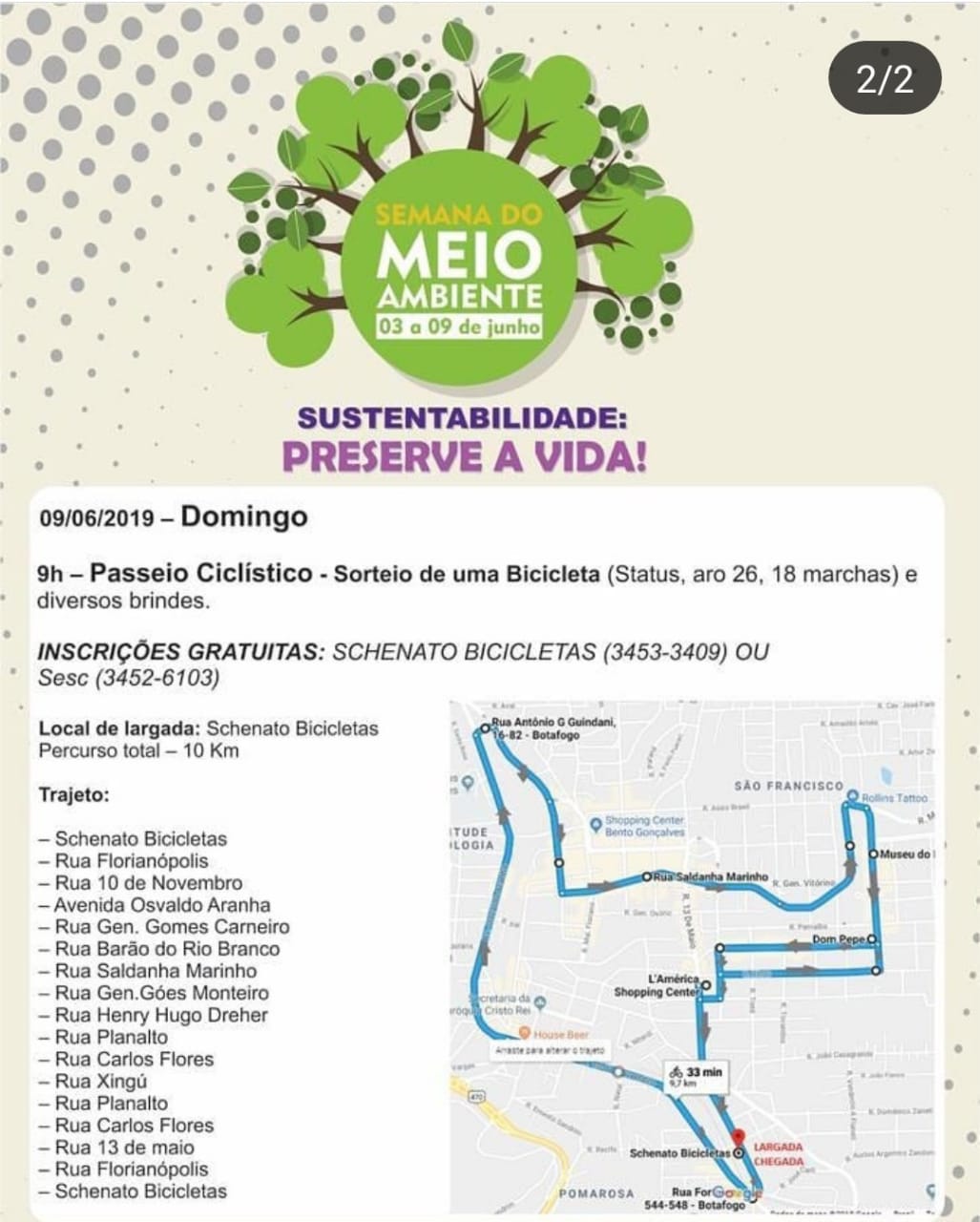 O evento é realizado em conjunto com a Schenato Bicicletas. O percurso, de um total de 10 km, inicia em frente ao estabelecimento às 9h. A atividade contará ainda com o sorteio de uma bicicleta e de diversos brindes.
