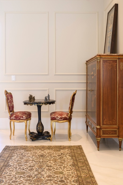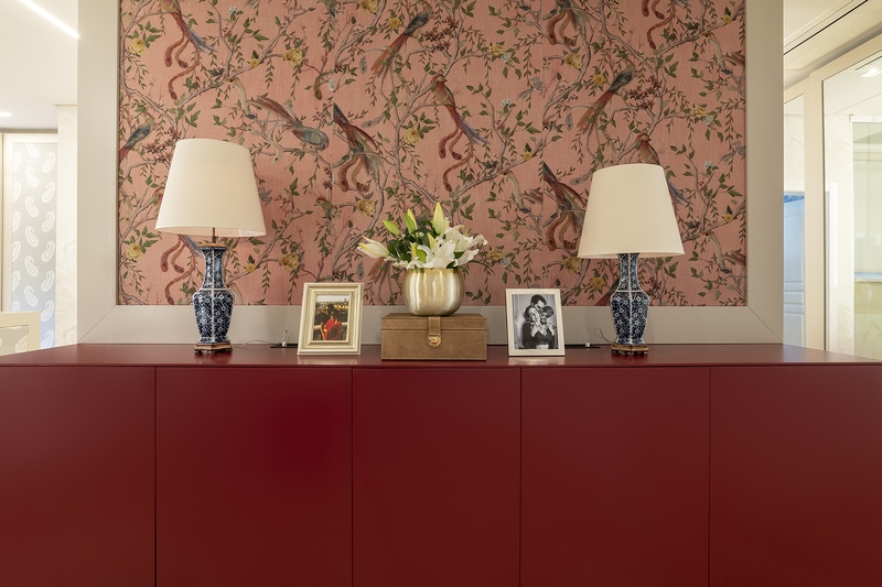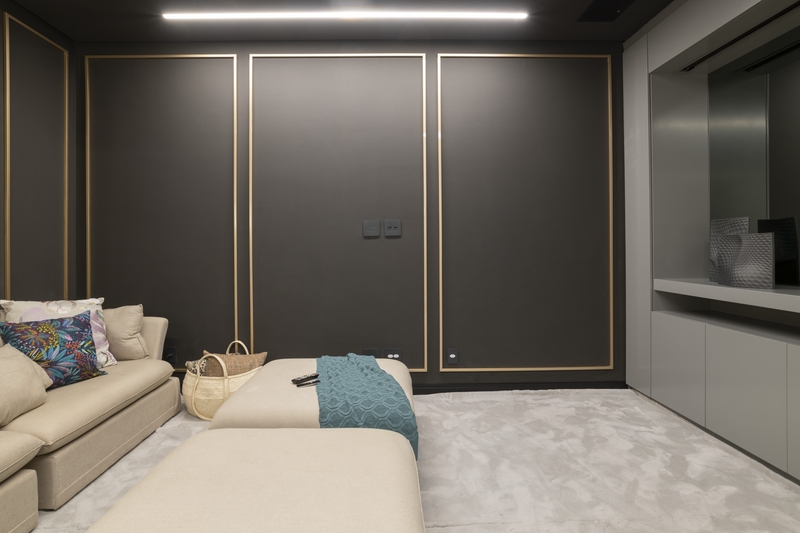 Ao mesmo tempo, o projeto revela aspectos que evidenciam a busca por manter uma unidade na Casa Sorrentino. Dentre eles, vale ressaltar as boiseries, espécies de molduras decorativas criadas na França por volta do século XVII, que imprimem charme e elegância. Elas estão representadas nas paredes das áreas sociais, onde foram aplicadas sob a alvenaria, e no mobiliário, como na cozinha, no qual nota-se um tamponamento em marcenaria, com formas mais puras; contrapondo com a brinquedoteca, onde as mesmas são mais originais, desenhando o estilo clássico das molduras. Nos espaços íntimos a proposta pode ser vislumbrada na suíte master, emoldurando as paredes e o closet, assim como, aparecem sob a forma de um delicado papel de parede no quarto do filho do casal, o pequeno Miguel.