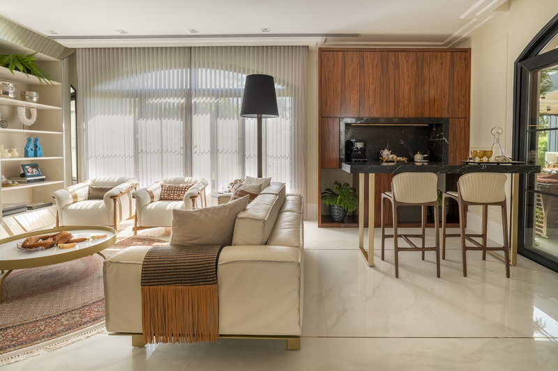 Para contemplar uma área de mais de 800 metros quadrados, o projeto civil da casa começou a ser desenvolvido em 2016, enquanto o de interiores se iniciou em 2019. Aquele apostou no estilo neoclássico, evidenciado no frontão e pilares da fachada, com traços mais contemporâneos, ao fundo. Um dos produtos finais desse arranjo foram as esquadrias que aparecem em formato de arco no primeiro pavimento, e no segundo, com linhas mais retas e retangulares.