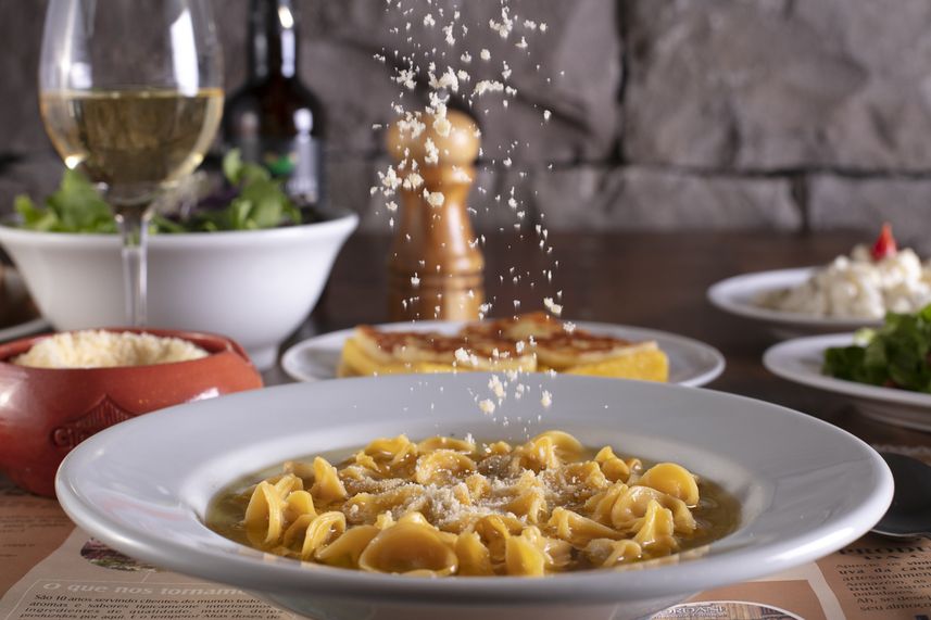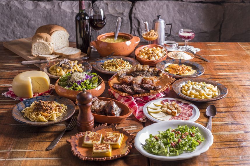 • O cardápio da casa inclui uma sequência de pratos típicos, 9 variedades de massas, 6 diferentes carnes e 4 opções de sobremesa, tudo servido livremente.