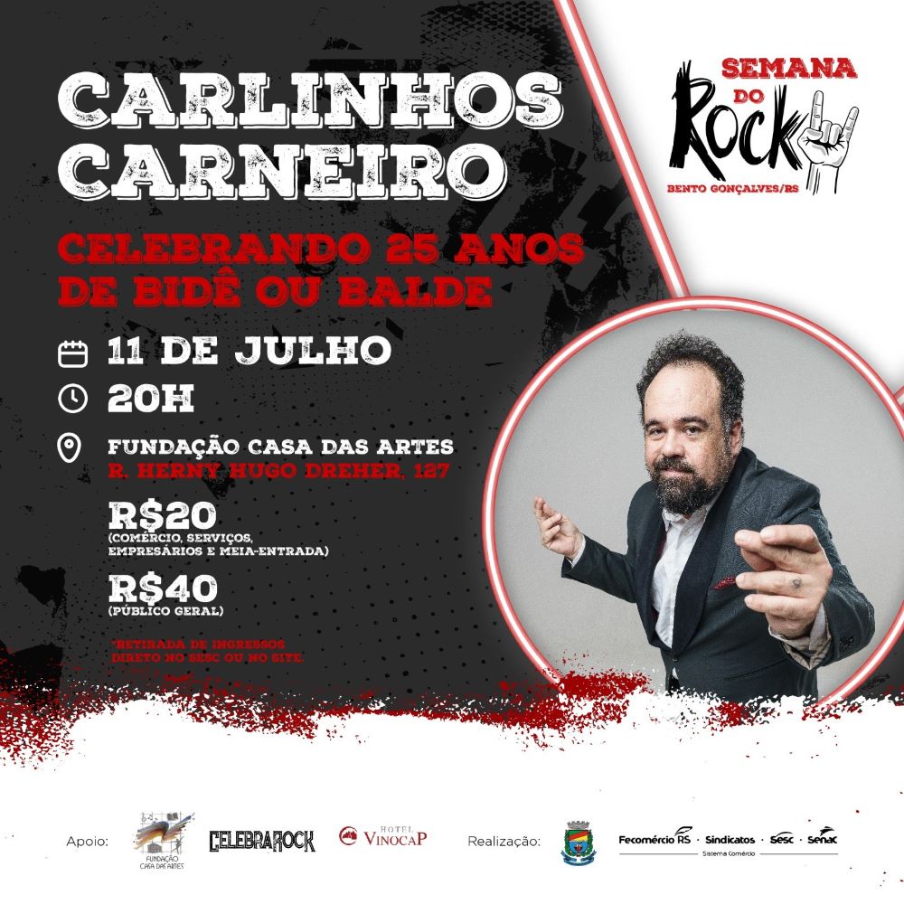 Uma das grandes atrações se apresenta no dia 11 de julho, às 20h, no Anfiteatro Ivo da Rold, na Casa das Artes. Ícone do rock gaúcho e nacional, Carlinhos Carneiro sobe ao palco em um show que celebra os 25 anos da banda Bidê ou Balde, grupo que o consagrou como um importante nome do rock nacional. No setlist, estão canções como “Melissa”, “Mesmo que mude” e “Me deixa desafinar”, que prometem despertar a nostalgia da plateia. Os ingressos custam R$ 20 para empresários, comerciários e dependentes com Credencial Sesc válida, e R$ 40 ao público em geral.