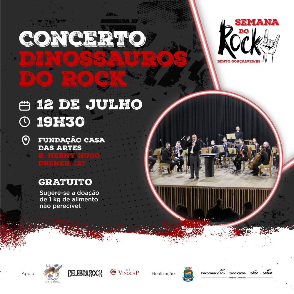 No dia 12 de julho, é a vez da Orquestra de Bento Gonçalves reprisar o seu já clássico espetáculo Dinossauros do Rock. Entrada gratuita. Sugere-se a doação de 01 quilo de alimento não perecível.