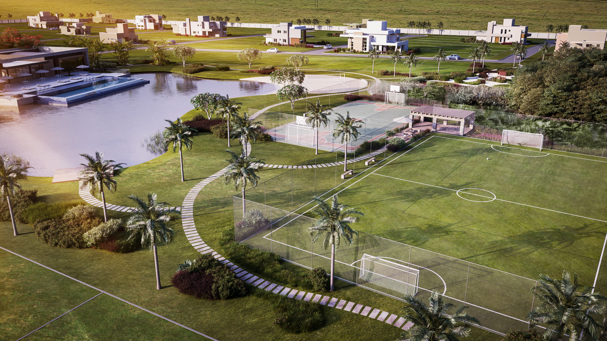 Entre os diferenciais, que são marca registradas em outros condomínios da empresa, como os conhecidos Condado de Capão, Enseada Lagos de Xangrilá e Costa Serena está o paisagismo, cujo conceito valoriza o encontro e o convívio das pessoas, ambientes naturais que propiciam o encontro familiar e entre amigos, com recantos, espaços de lazer e prática de esportes e ambientes livres para os pequenos. “Isso tudo acontecendo junto ao lago de 4 mil metros quadrados, com prainha e beach tênis”, destaca Ricardo. No que se refere a segurança, o Arenas terá portaria, monitoramento por câmeras e ronda pelo perímetro interno dos muros de 2,5 metros de altura.